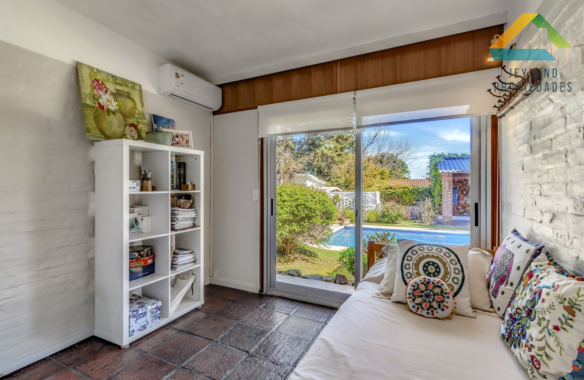 En el exterior, se destaca una piscina privada junto a un parrillero, perfectos para reuniones y momentos de relax.