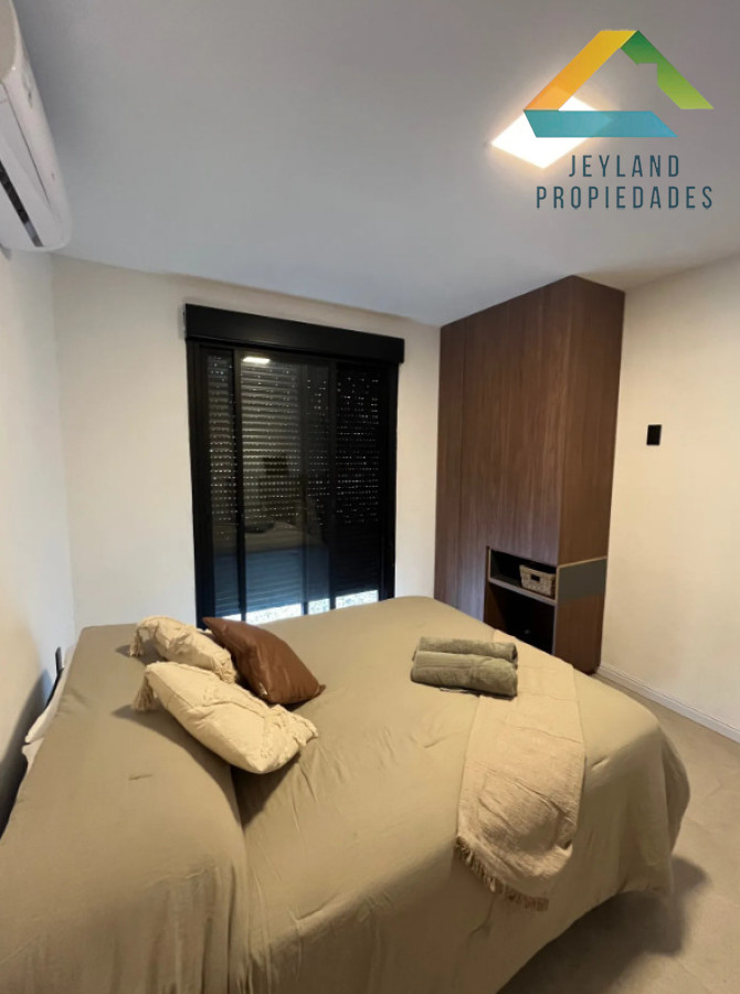 Ambiente luminoso con placard integrado, aire acondicionado y salida a exterior mediante aberturas con persianas.
